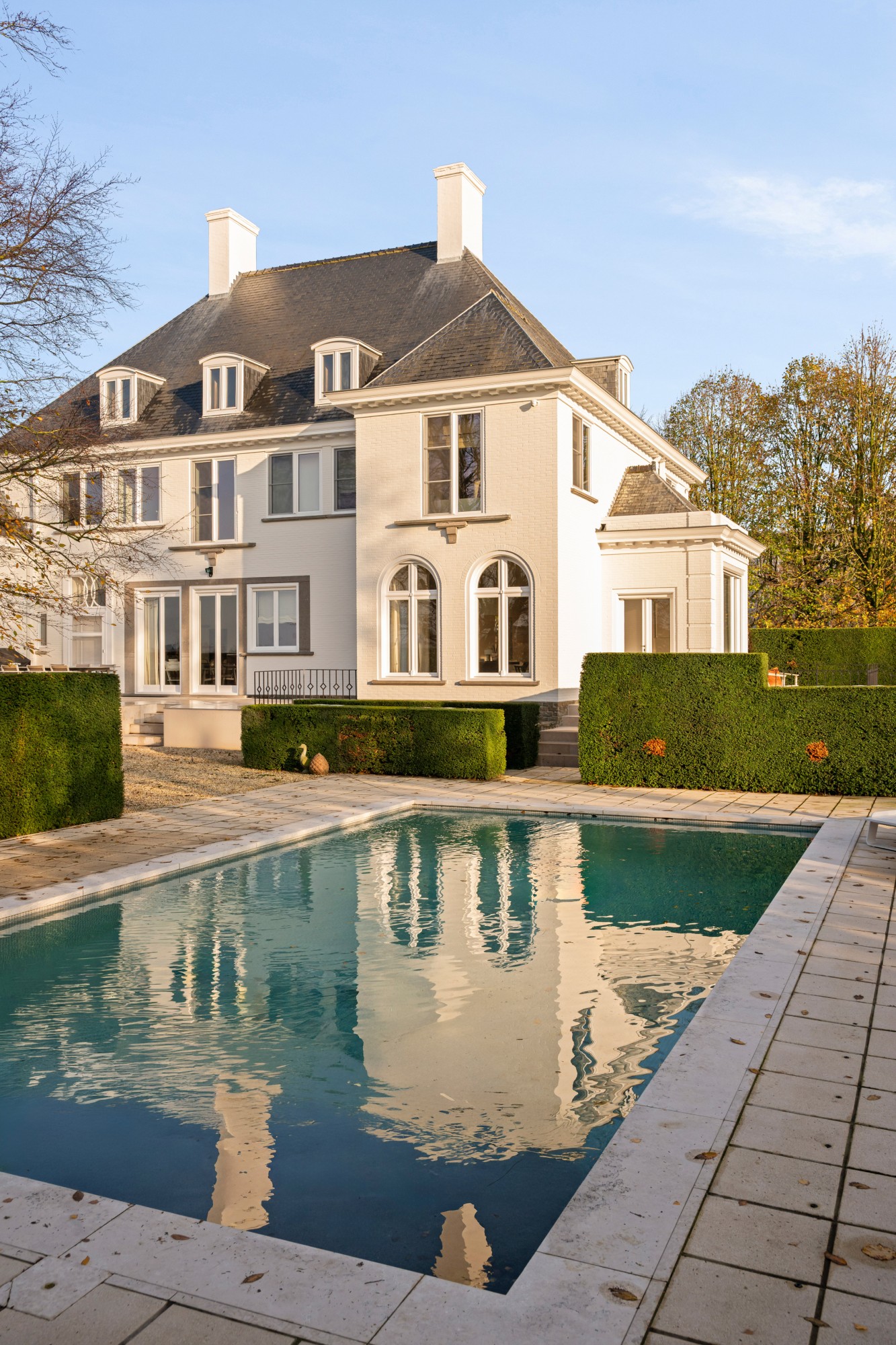 De gelijkvloerse verdieping verwelkomt u via een royale inkomhal met vestiaire en gastentoilet. Aansluitend bevindt zich een stijlvolle bureauruimte en een indrukwekkende leefruimte met open haard, badend in natuurlijk licht en uitgevend op de prachtig aangelegde tuin. De keuken vormt een waar statement: volledig maatwerk, uitgerust met hoogwaardige toestellen en naadloos verbonden met de bijkeuken/mudroom. De voormalige inpandige garage werd discreet geïntegreerd als polyvalente ruimte die perfect kan dienen als home-office alsook ontvangstruimte of bar. Via een statige eiken trap bereiken we de eerste verdieping. De master suite vormt een serene privéwereld met dressing en luxueuze ensuite badkamer. Daarnaast zijn er drie volwaardige slaapkamers evenals een bijkomende badkamer.